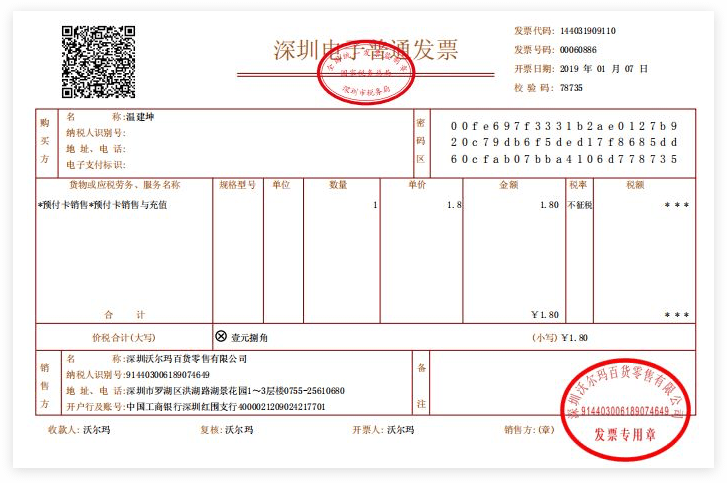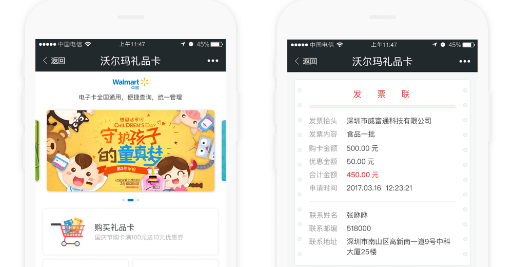 2019年新年伊始,威富通成功助力沃尔玛推出区块链电子发票。关注沃尔玛公众号,购买或充值购物卡进入“帮助中心”点击“发票与报销”选择订单即可开票,整个过程方便快捷,不到1分钟即可完成操作。