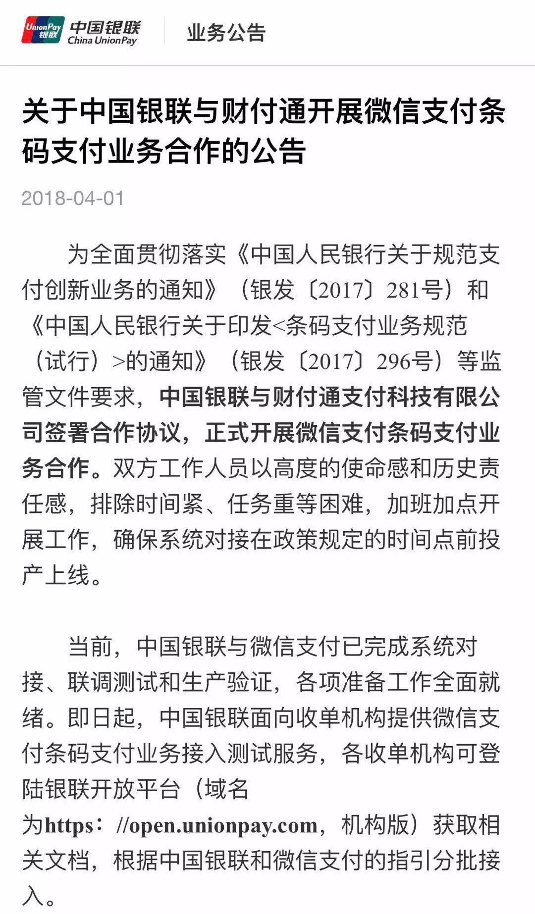 2018年4月1日,中国银联正式发布公告,为全面贯彻落实中国人民银行相关监管文件要求,中国银联与财付通支付科技有限公司签署合作协议,正式开展微信支付条码支付业务合作。同时中国银联也做好了为其它机构提供转接清算服务的准备。